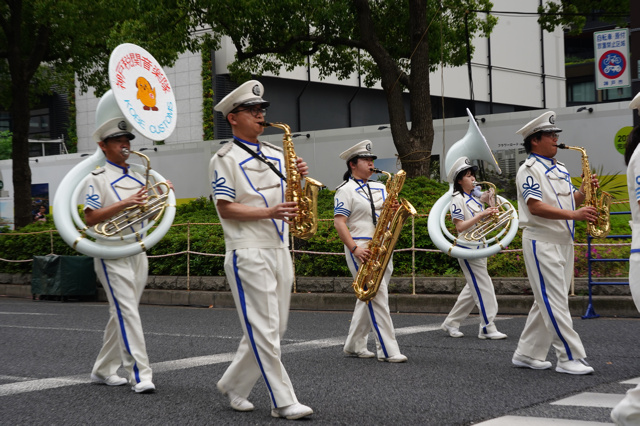 15年ほど前に行った時と だいぶん事情が変わっていて、 観覧場所は東側のみで 枠があって座れなくなっていた。 60団体ほどが 目の前を行進していくのだが、
