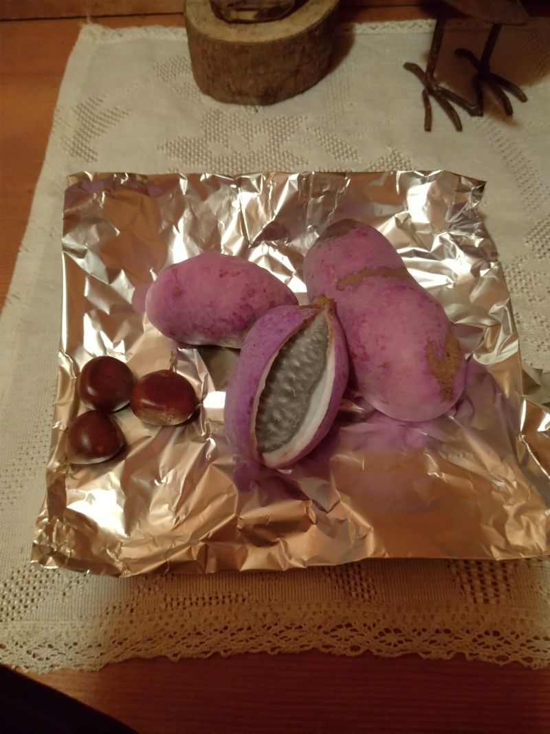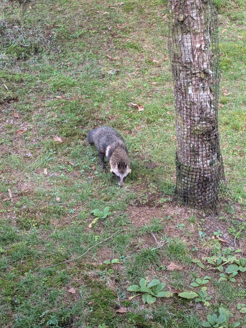 落ちた実を三匹の狸の母子が
